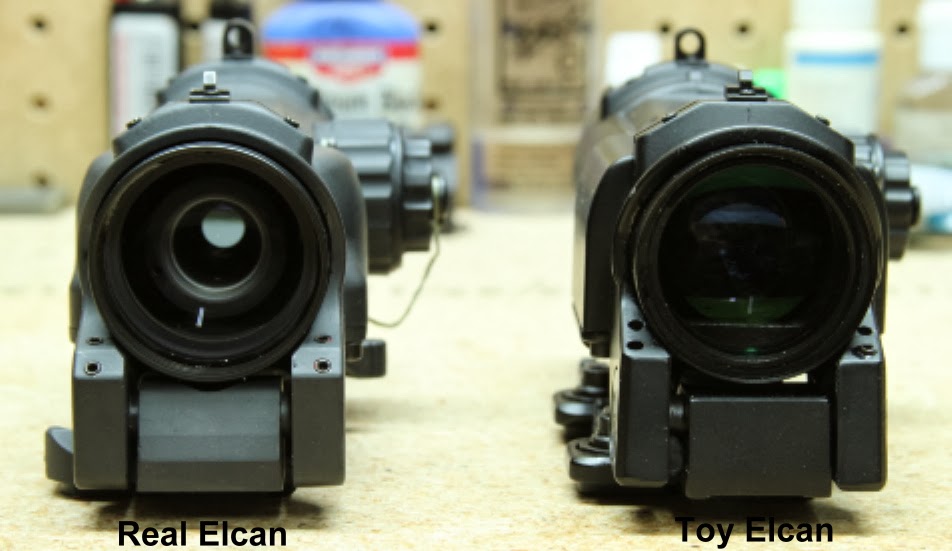 Frontal view. The G&G replica has a slightly smaller objective lens. One thing that is very, very apparent is that the replica does not pass through any light at all. looking from the front of the scope inward, it’s pitch black in there. The real Elcan collects huge amounts of light, and in truth there isn’t much else out there in the real steel optics market that compares to how much light the Elcan grabs.
